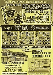 年末恒例「百春新酒しぼりたて即売会」のお知らせ。12月28日(土)、29日(日)10時~15 時開催