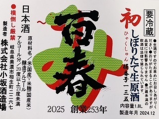 年末年始のお酒は、「百春」で!。しぼったばかりのお酒をろ過をせずに、直接瓶詰めしました。酵母の出す天然の炭酸ガスが含まれ、ピリピリ感がたまりません。