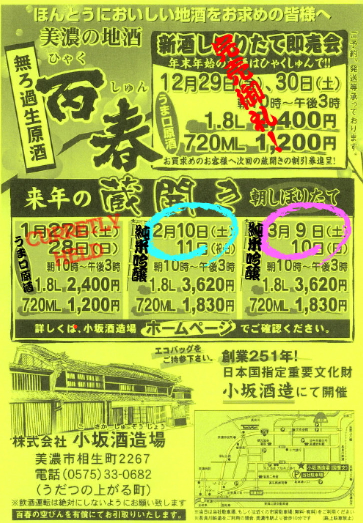大好評!「百春 朝しぼりたて生原酒の即売会」のお知らせ 1月27日(土)、28日(日)10時~15時開催